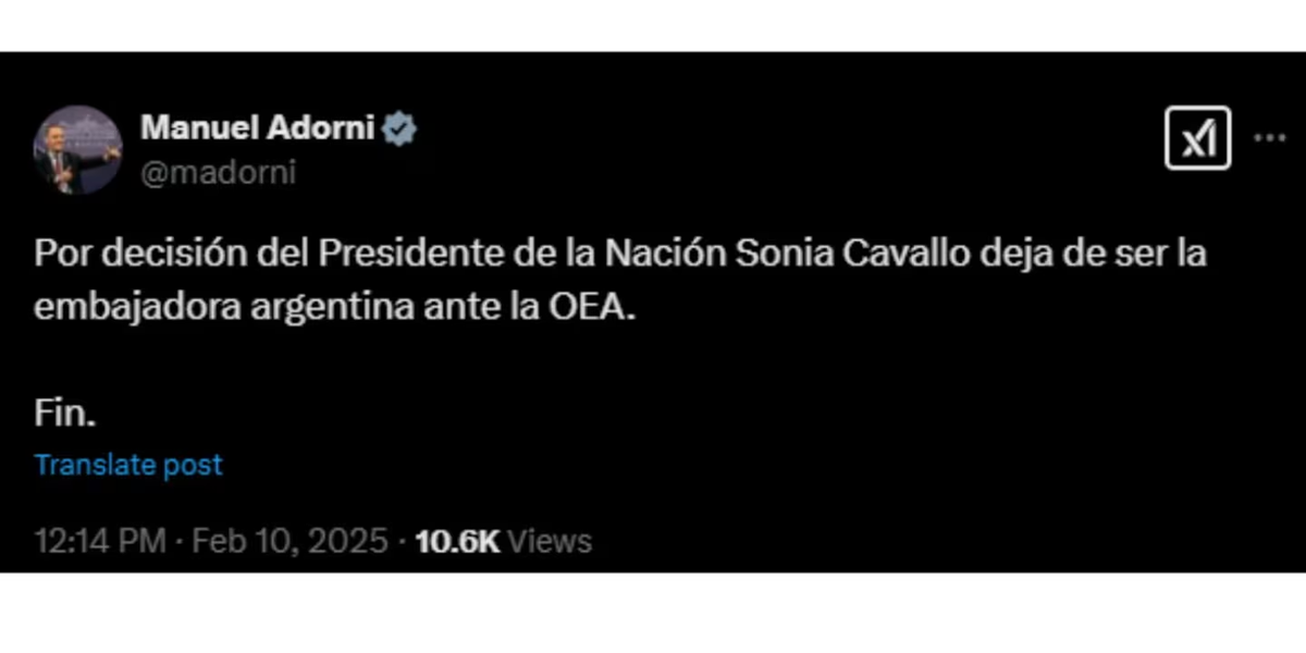 -También, Francos abordó la escandalosa salida de Sonia Cavallo de la OEA: “La desafectación como embajadora de la Organización de Estados Americanos fue una decisión política del presidente. Su designación tuvo que ver con que era hija de Domingo Cavallo y su reemplazo también”.