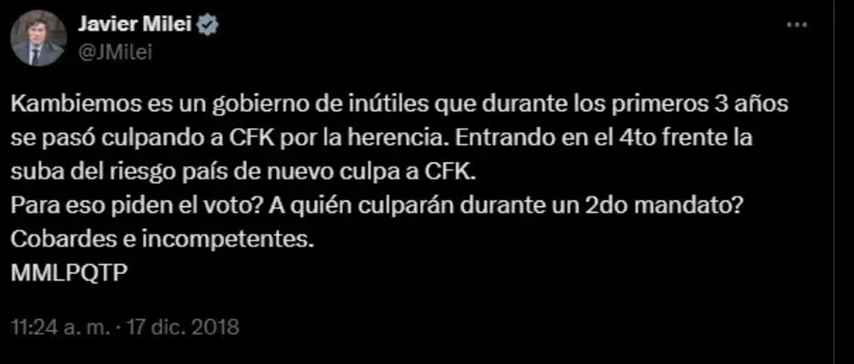 Ahora, con la disparada del Riesgo País -que este viernes 19/09 roza los 1.500 pb- comenzaron a viralizarse en X dos posteos del Presidente cuando no era Presidente. Específicamente, en 2018, cuando cargaba duramente contra Mauricio Macri, ahora su aliado.