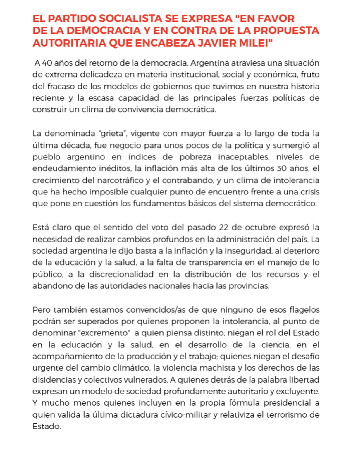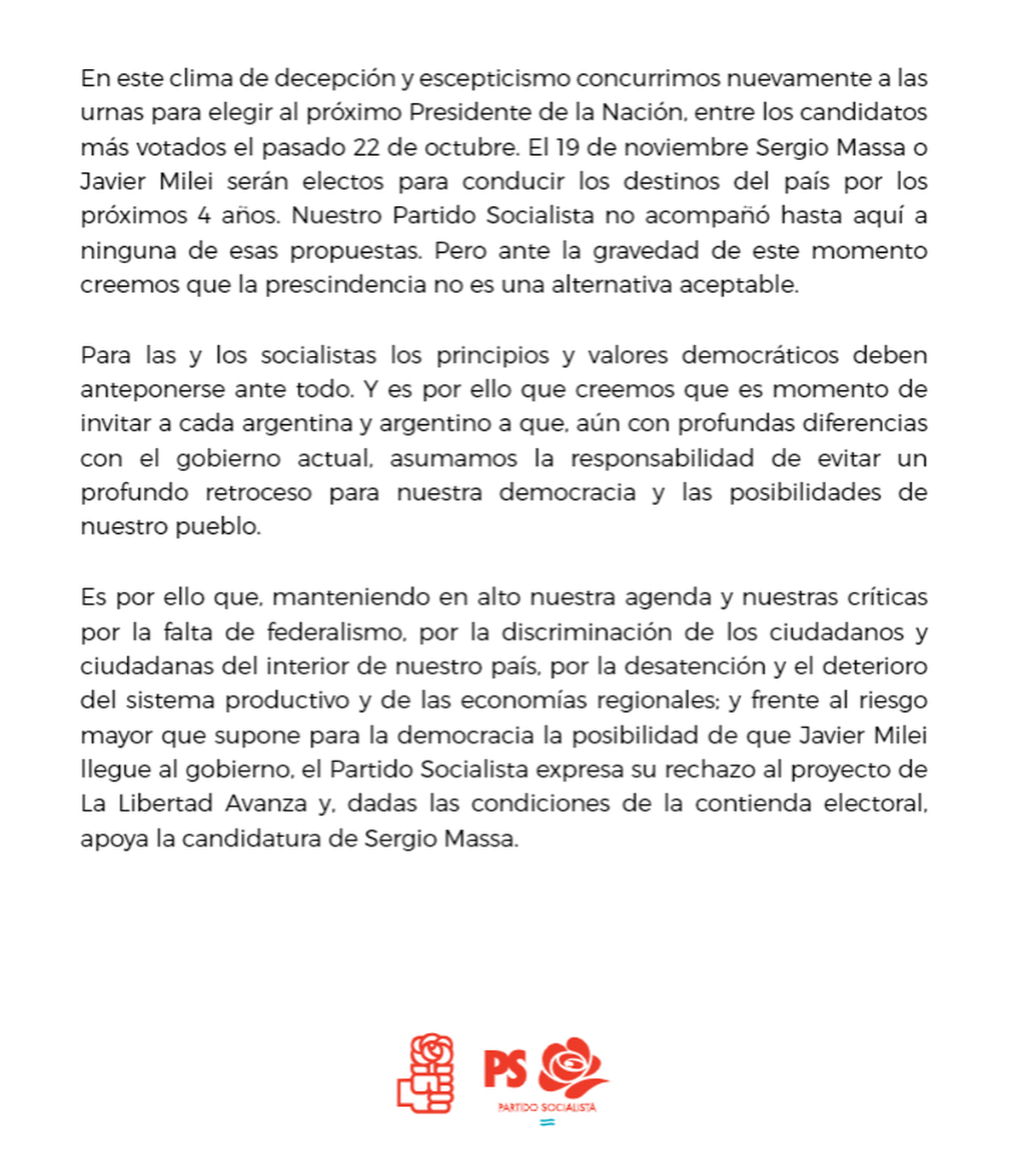 En este marco, y aclarando que mantienen "en alto" su "agenda" y "críticas", "frente al riesgo mayor que supone para la democracia la posibilidad de que Javier Milei llegue al gobierno, el Partido Socialista expresa su rechazo al proyecto de La Libertad Avanza y, dadas las condiciones de la contienda electoral, apoya la candidatura de Sergio Massa".