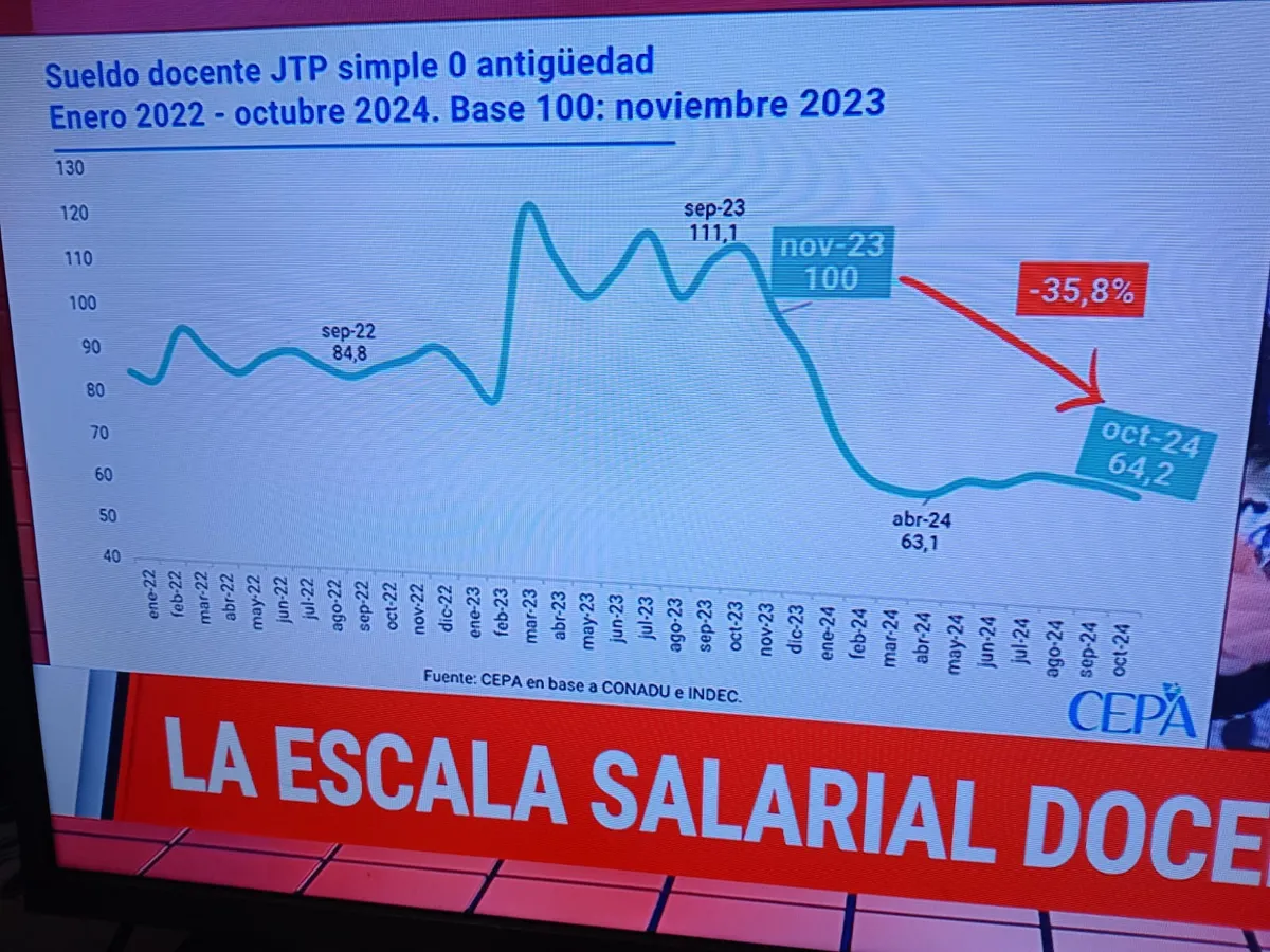 En el caso de los docentes, la pérdida en sus ingresos sería del 36% para 2024 y se mantendría una quita idéntica en 2025 si se aprobara el presupuesto que el primer mandatario libertario propuso en la “ley de leyes”.