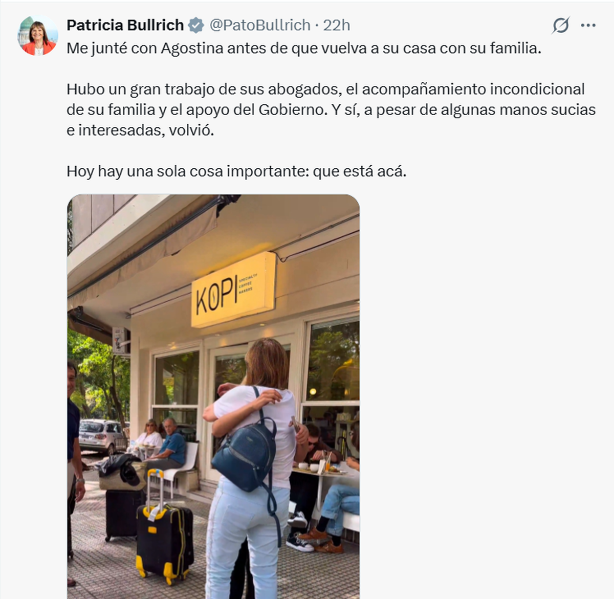 Al regresar a la Argentina, y antes de viajar a Santiago del Estero donde reside, Agostina Páez se reunió con Patricia Bullrich, que parece querer aprovechar políticamente cualquier hecho, aunque sea polémico...