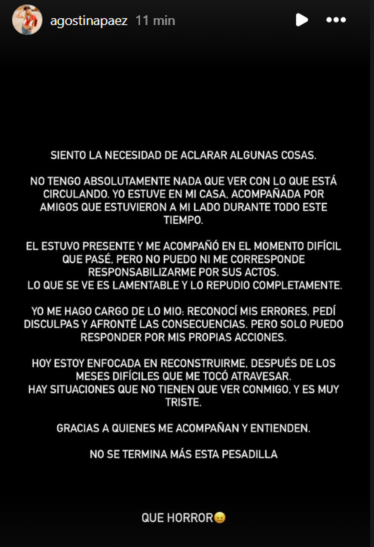 Si bien se abrió la polémica sobre si el video es real o hecho con Inteligencia Artificial -dado que ese habría sido el argumento del hombre- Agostina salió rápidamente a 'despegarse' de su padre con un posteo. La joven no desmiente el video, sino que toma distancia, e incluso expresa su "repudio" (quizás asesorada por su defensa...)