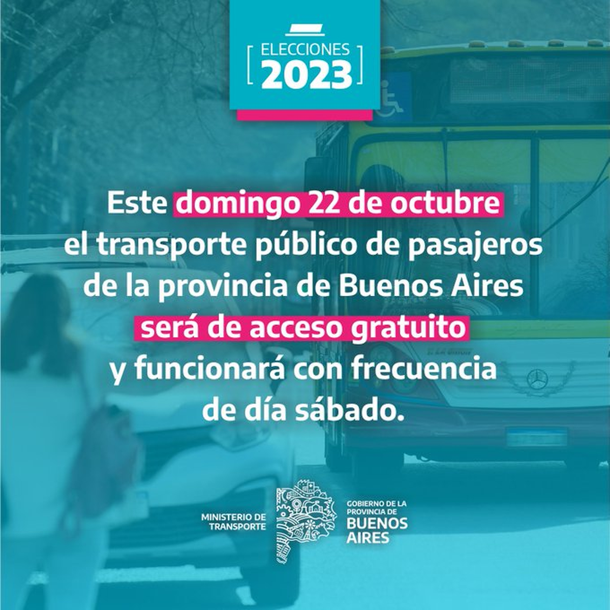 El transporte público será gratis en la provincia de Buenos Aires durante toda la jornada electoral. El ministro de Transporte bonaerense, Jorge D´Onofrio confirmó que tanto la movilidad automotor como la fluvial no tendrán costos el día de los comicios presidenciales y dijo que "cada vecino va a poder viajar para renovar su compromiso con la democracia sin que el servicio de un feriado sea una barrera". El Ministerio de Transporte bonaerense estableció la gratuidad del transporte público para este domingo y dispuso la frecuencia de día sábado para cada formación de jurisdicción provincial con el objetivo de consolidar la participación ciudadana y garantizar el derecho a voto en todo el territorio bonaerense, se informó este miércoles.
