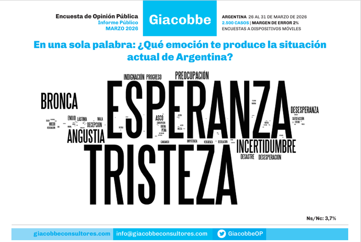 Esta erosion de la imagen presidencial tiene como trasfondo un escenario en el que la "tristeza" ya ocupar un lugar similar a la "esperanza" en la nube de palabras de la encuesta referida a las "emociones" que embargan a los consultados en relación a la situación actual del país.