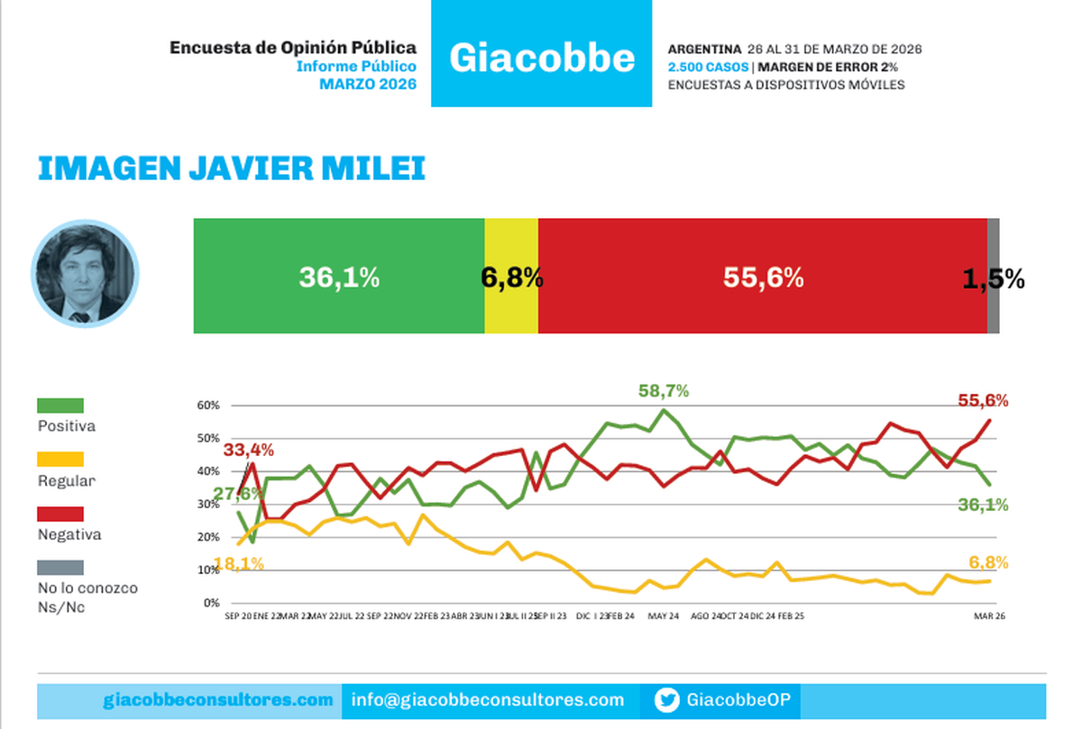 De acuerdo al trabajo, Milei conserva una aprobación del 36,1%, lo que implica una caída de 5,6 puntos porcentuales en relación a la medición de febrero, pero una retracción de 11 si se lo compara con la medición de noviembre.