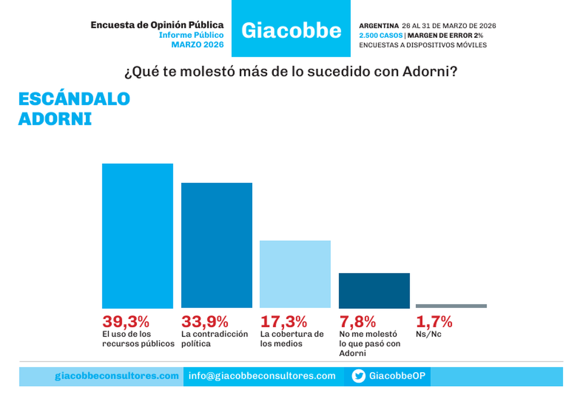 En relación a ese caso, el 73% de los consultados se vio molesto ya sea porque vio un uso de los recursos públicos (39,3%) o por la "contradicción política" entre los hechos denunciados y el discurso del propio Adorni (33,9%).