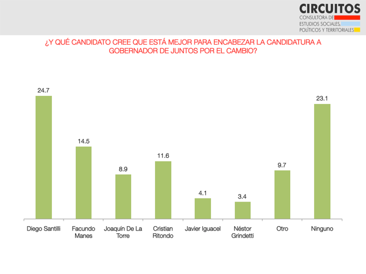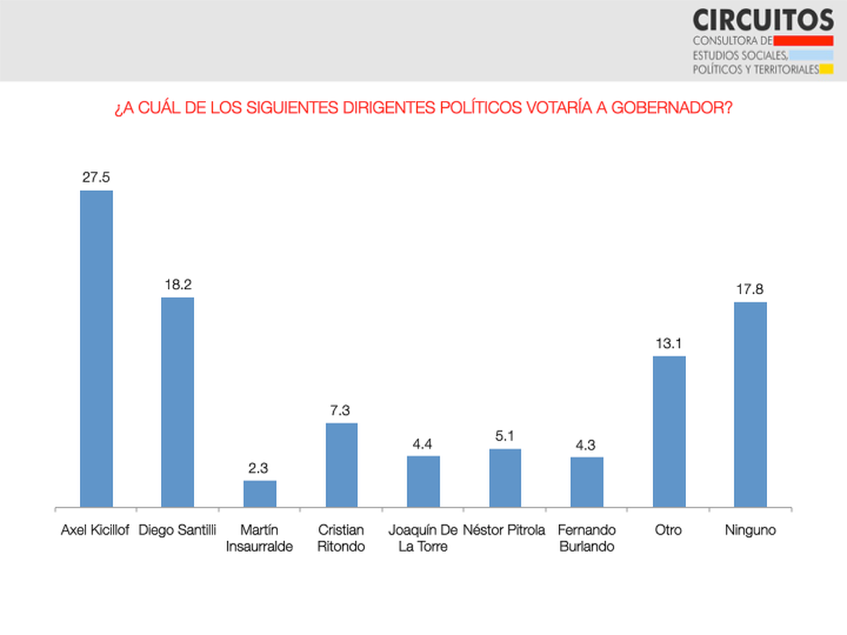 La encuesta de Circuitos también ofrece un escenario para la gobernación. Hay un dato llamativo: en una virtual interna de JxC, Santilli encabeza las preferencias con el 24,7%, 5 puntos por encima de Larreta, su referente a nivel nacional, que en el capítulo nacional de la primaria queda 20 puntos detrás de Bullrich (39,7%) . Es como si se produjera un corte de boleta entre quienes optan por el actual diputado pero no por el jefe de Gobierno porteño, en este caso, en beneficio de Santilli.