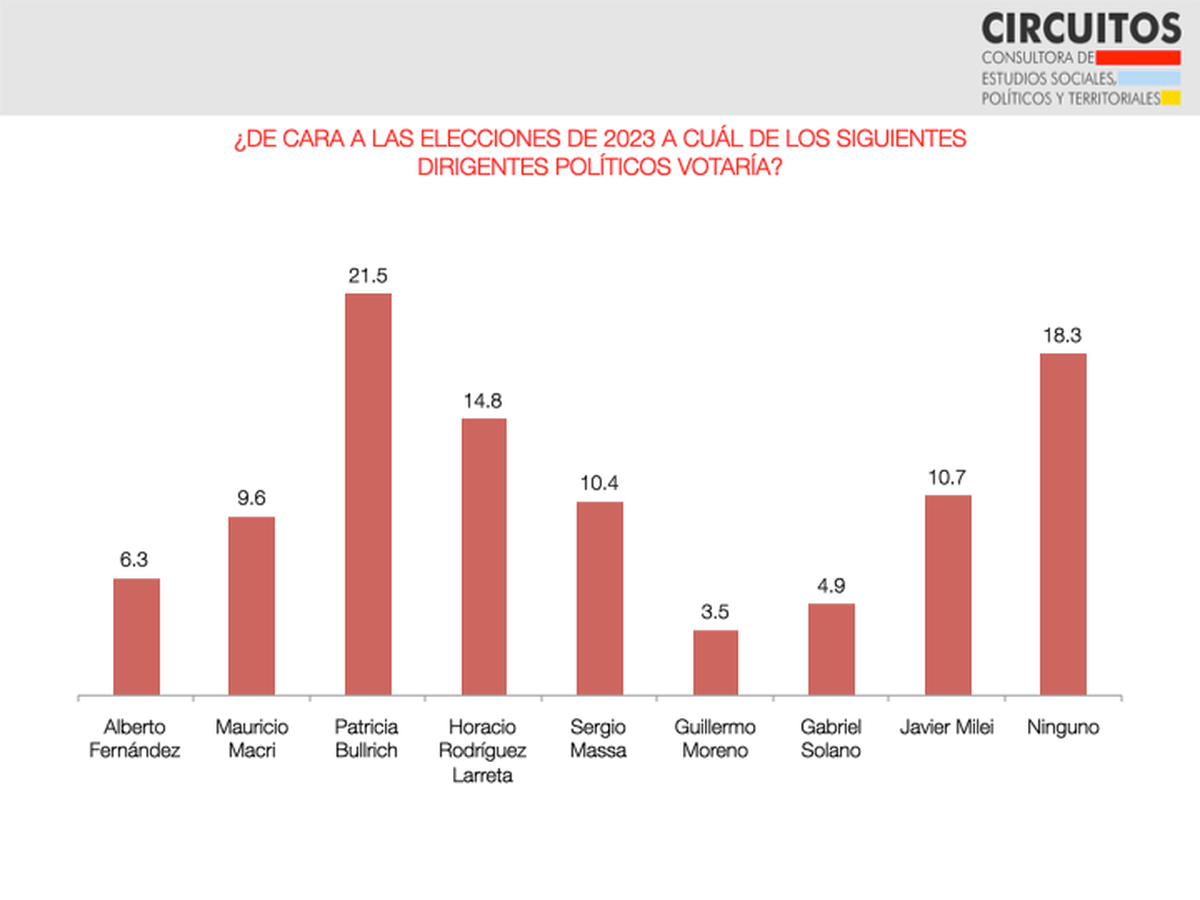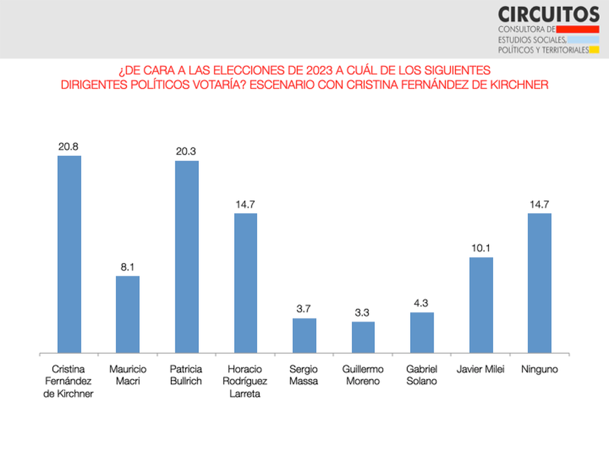 Más datos de Circuitos: Bullrich supera también a los candidatos oficialistas, como Alberto Fernández y Sergio Massa. Y si Cristina Kirchner se agrega al menú, hay un empate entre ambas dirigentes.