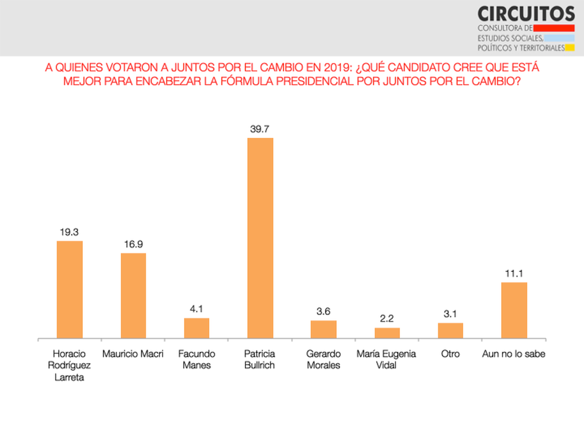 Hay datos que respaldan el esquema que se plantea de forma subterránea. Por ejemplo, la última encuesta de la consultora Circuitos muestra a Bullrich muy potente en el principal distrito electoral. En un simulacro de PASO, encabeza la intención de voto con el 21,5%, 6,7 puntos por encima de Larreta (14,8%). La encuesta se realizó entre el 21 y el 23/03, previo al anuncio de Macri, por lo que éste también fue medido. Muy probablemente la mayor parte de los casi 10 puntos que consiguió el exPresidente en esta encuesta migren hacia Bullrich en el próximo.