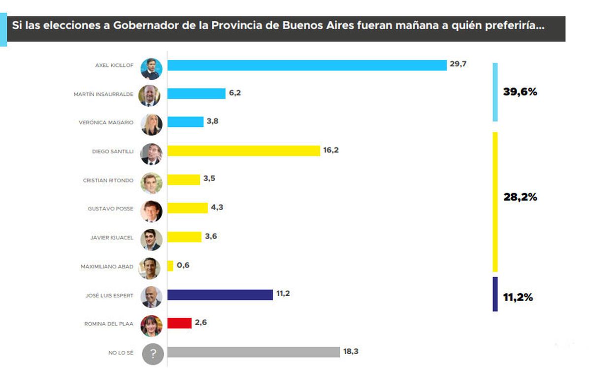 De esa forma, el FdT se impone a JxC, que con Diego Santilli como ganador de un eventual interna acumula un total de 28,2%. Luego aparece el liberal José Luis Espert con un 11%, seguido de la izquierdista Romina del Pla, con 2,6%. En este escenarios los indecisos alcanzan el 18,3%.