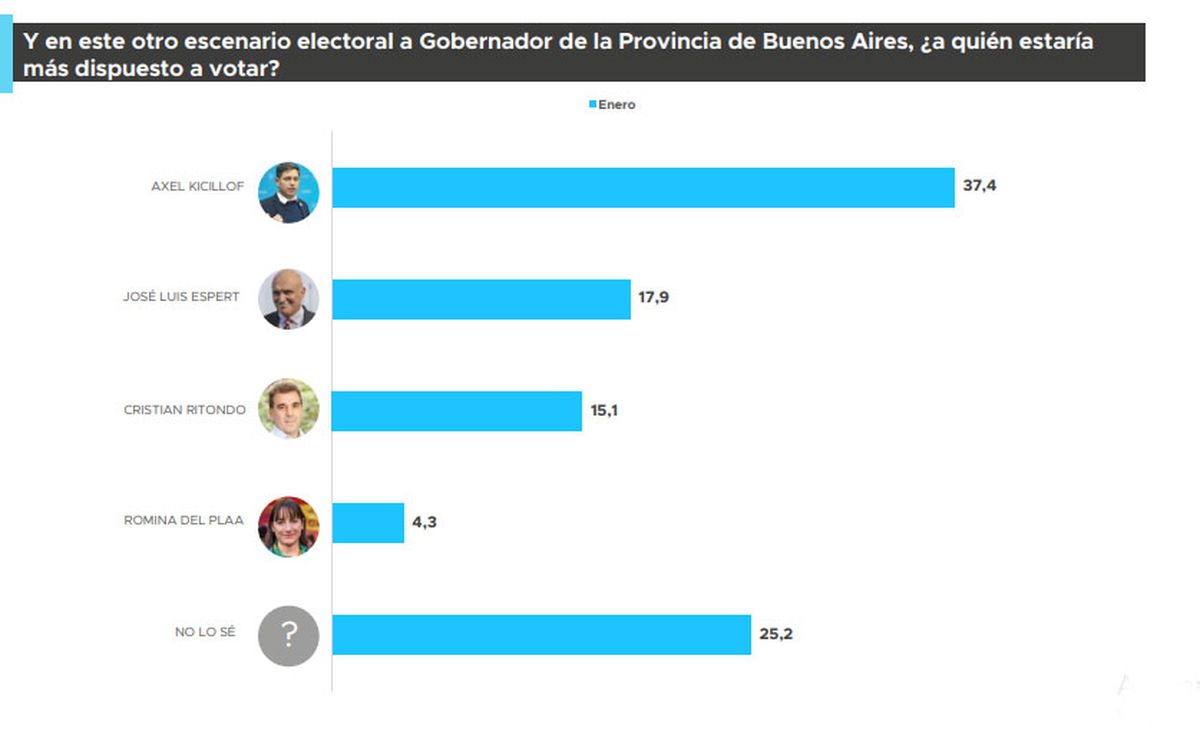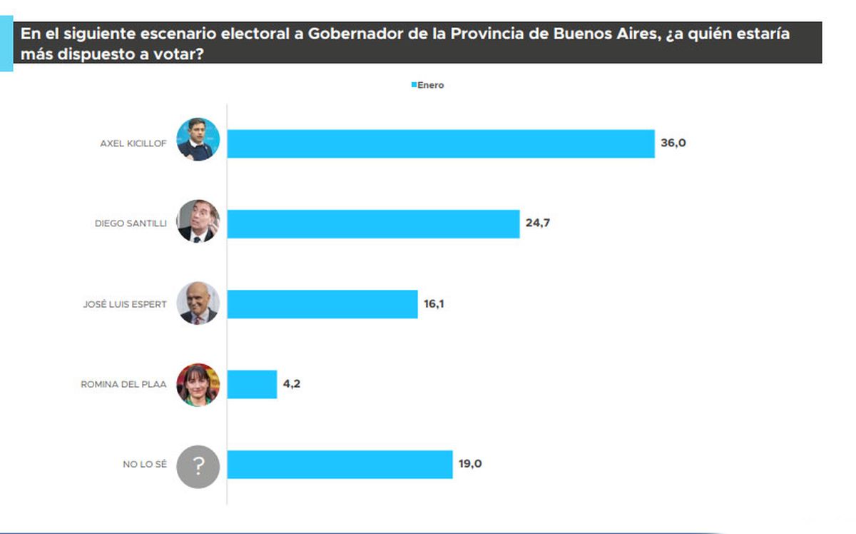 "En algún momento se pensó que la elección ya estaba definida. En provincia de Buenos Aires no es así. Si bien Kicillof aparece 12 o 13 puntos arriba, la elección va a ser reñida. Lo que estamos viendo es una foto de enero. Veremos cómo sigue más adelante la evolución de la opinión pública", concluyó el director de la consultora Proyección.