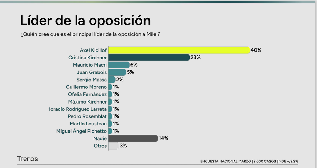 En efecto, de acuerdo a la encuesta, Kicillof lidera la percepción en ese sentido con el 40%, dejando a la exPresidente, hoy detenida, 17 puntos atrás.