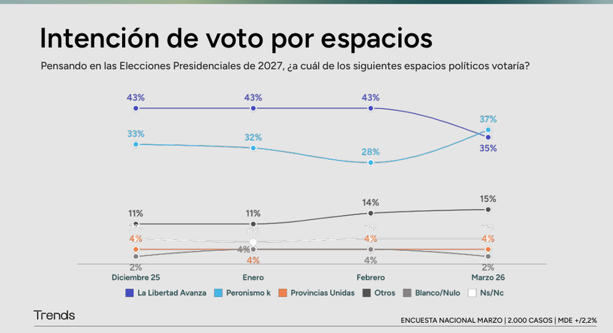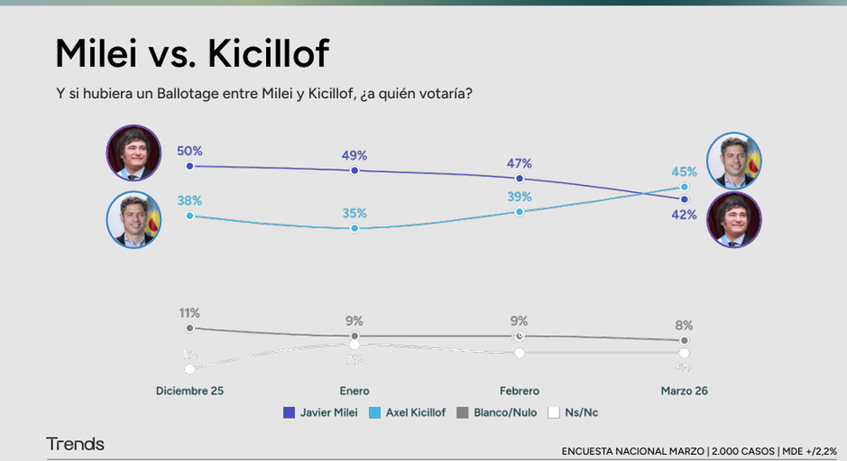El mismo fenómeno se observaría en el balotaje. En la encuesta de Trends, Milei pierde 5 puntos porcentuales desde febrero (8 desde diciembre). Kicillof, en cambio, gana 6 puntos en el mismo lapso (+10 desde el piso de febrero), que se alimentarían de la retracción presidencial y del punto que pierden los indecisos.