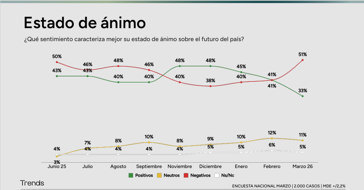 El pesimismo se dispara: El estado de ánimo negativo sube 10 puntos en un mes, hasta el 51%, mientras que el positivo cae hasta el 33%.