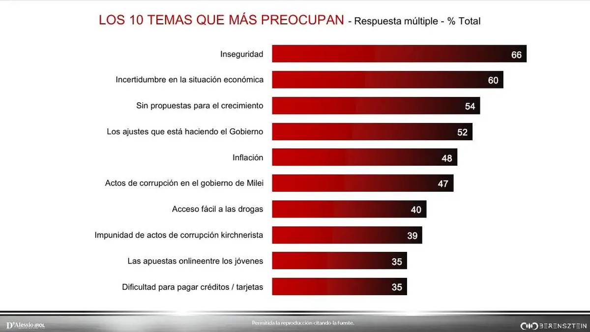 Por otro lado, en cuanto a los temas que más le preocuparon a los argentinos, la inseguridad se ubicó en el 1er lugar de las respuestas seguida por la incertidumbre en la situación económica y la falta de propuestas para el crecimiento. Los ajustes del Gobierno superaron a la preocupación por la inflación y últumo quedó la dificultad para pagar créditos o tarjetas.