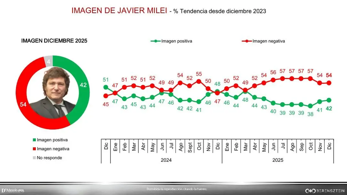 Milei también dejó de aumentar su imagen negativa, que el año pasado tuvo picos de 57% desde julio y hasta octubre (meses donde el Gobierno atravesó los escándalos por el Andisgate, el caso Espert y $Libra), el mes de los comicios donde se impuso el oficialismo en las urnas, desde entonces empezó a descender.