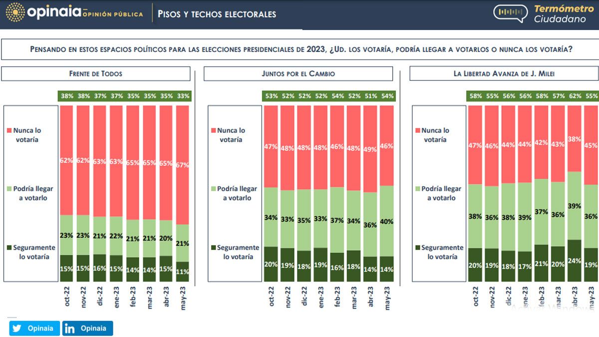 Juntos por el Cambio, en tanto, mantiene su piso de abril (14%), pero aumenta hasta 40 puntos su voto potencial, lo que le resulta en un techo del 54%, 4 puntos por encima del registro del mes pasado.