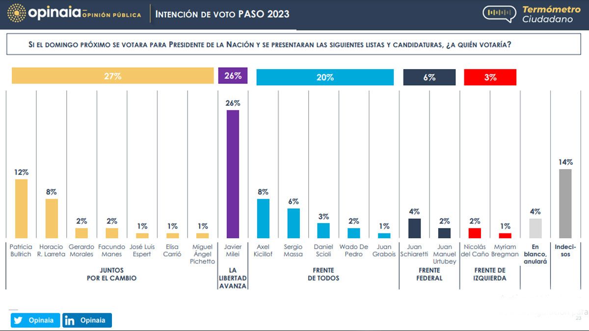 El oficialismo registró una notable pérdida de intención de voto, aunque no fue capitalizado ni por JxC ni por Milei, según la encuesta de Opinaia.