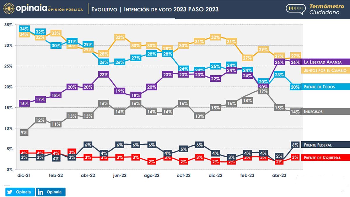 El Frente de Todos registró una fuerte caída de intención de voto de acuerdo a la encuesta de mayo de la consultora Opinaia.