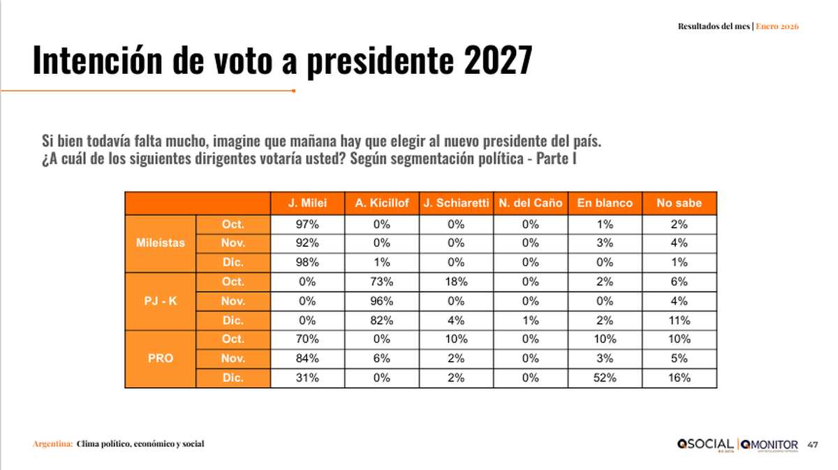 Entre octubre de 2025, 70% de los electores del PRO había respondido que votaría la reelección del Presidente, número que creció 14 puntos en noviembre tras el triunfo electoral oficialista en los comicios de medio término. Pero durante el mes siguiente, ese apoyo se derrumbó nada menos que 53 puntos porcentuales de acuerdo a este trabajo.