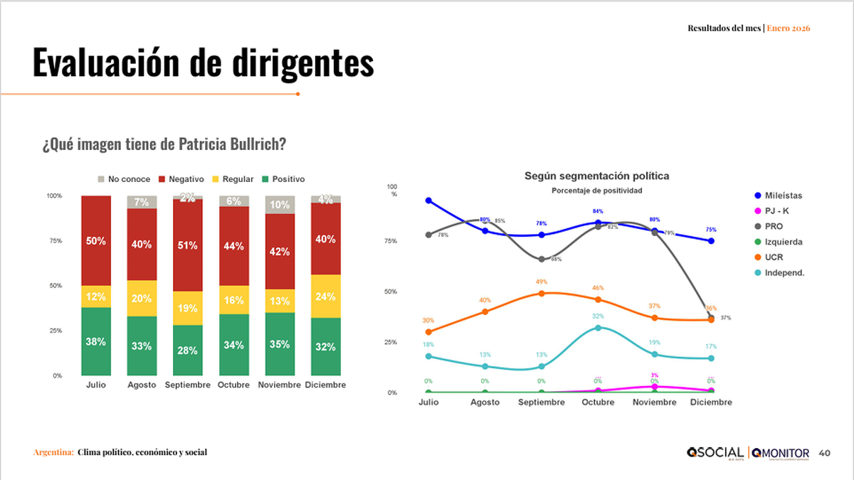 Por el contrario, en ese mismo segmento se produce un derrumbe de la aprobación de Patricia Bullrich, quien fuera presidente del PRO: su imagen positiva pasó del 79% en noviembre al 37% en diciembre, un declive de 42 puntos en sólo un mes.