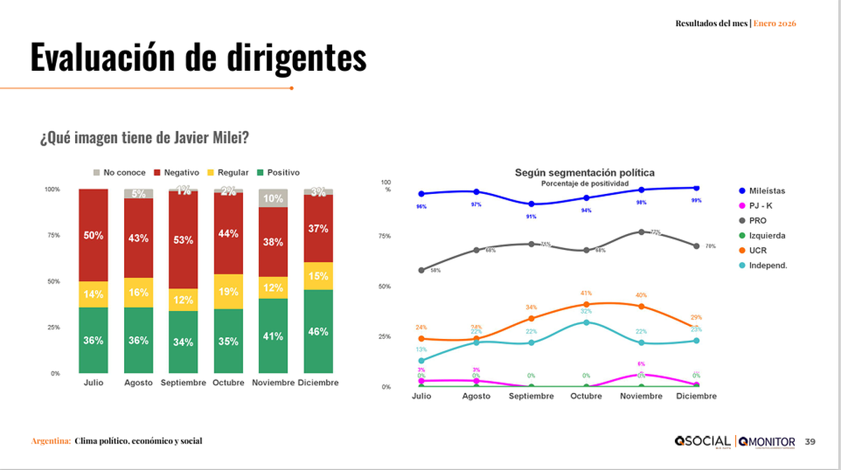 Por ejemplo, en lo que respecta a la situación del país, mientras que los mileistas que tienen una visión positiva muestran una curva ascendente que alcanza el 72%, entre los electores 'amarillos' el optimismo cae 7 puntos, hasta el 18%. Si se extiende la curva, el resultado de diciembre está 19 puntos por debajo del pico del 37% alcanzado en septiembre.