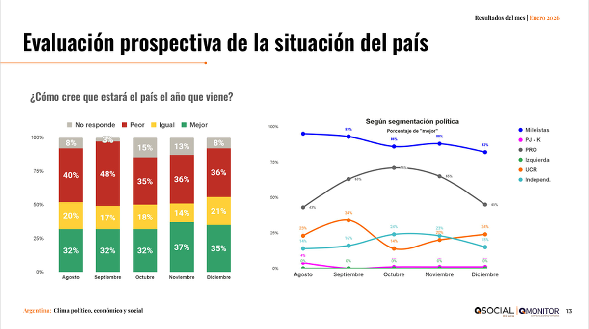 Por otro lado, se exhibe un derrumbe descomunal en lo que refiere a las expectativas. Consultados sobre cómo creen que estará el país en 2026, el 45% de los electores macristas respondió que "mejor", 20 puntos menos que en noviembre y casi 30 menos que en octubre.