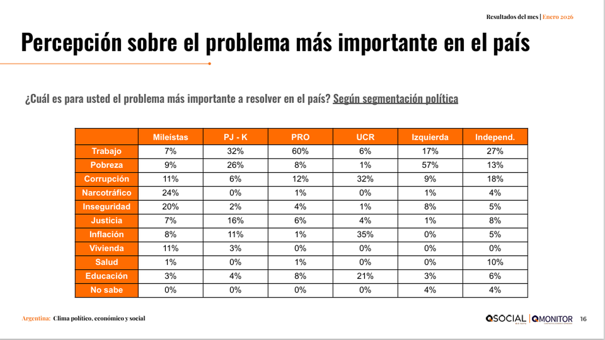 Mientras que entre los votantes libertarios sólo el 7% ubica la situación laboral como el tema "más importante a resolver" y se concentra la preocupación entre el narcotráfico (24%) y la inseguridad (20%), entre los votantes del PRO la inquietud por el trabajo abarca al 60% de los consultados.