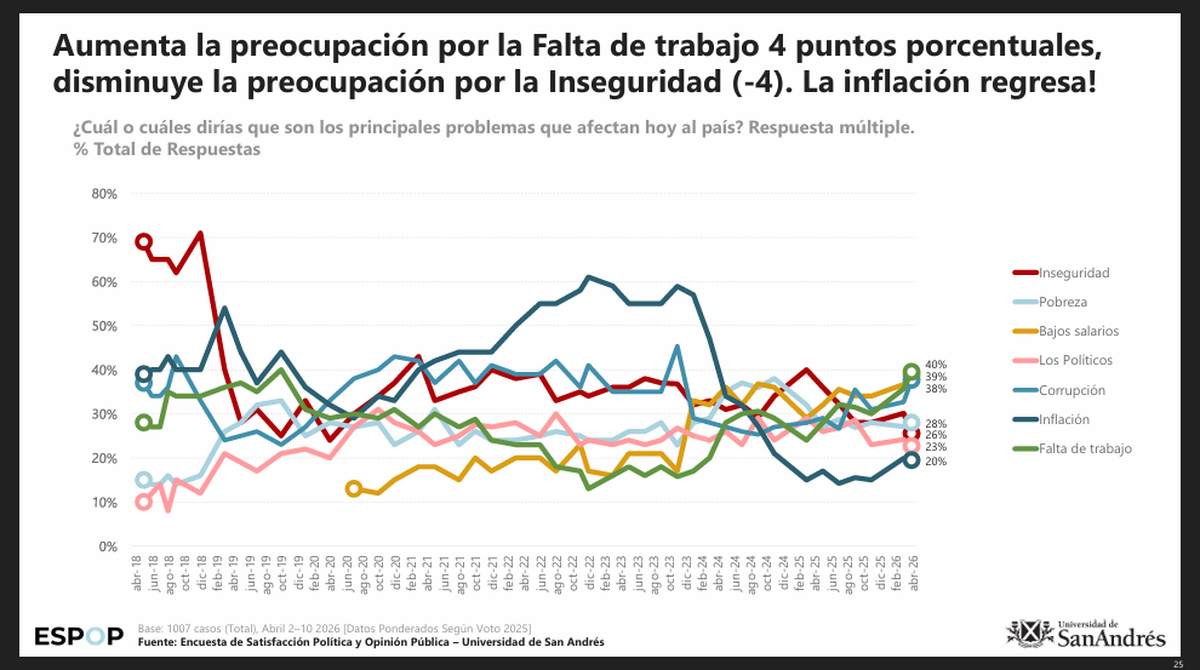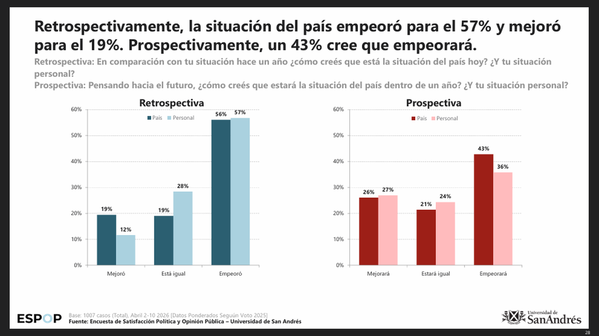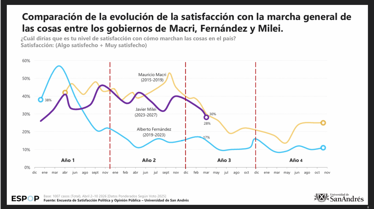 En abril 2026, en cambio, se produce una caída de 5 puntos en comparación con marzo y un desplome de 12 puntos en relación a la medición de noviembre del año pasado, tras la victoria oficialista en las elecciones, cuando la percepción positiva remontó hasta el 40%.