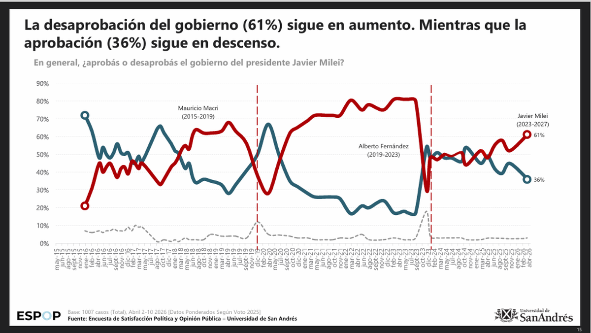 En ese contexto, la aprobación del Gobierno mantiene un sesgo a la baja, y en la última medición de UdeSA registra un 36%, 2 puntos menos que en marzo, que se trasladan a la desaprobación, que alcanza el 61% y se ubica en el punto máximo en lo que va del período libertario.