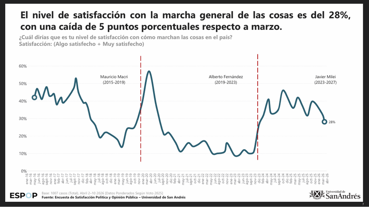 De acuerdo al estudio al que accedió Urgente24, en abril sólo el 28% de los consultados se mostraba satisfecho con la "marcha general de las cosas", un resultado sólo comparable con el 26% de enero de 2024, poco después de la asunción de Milei.