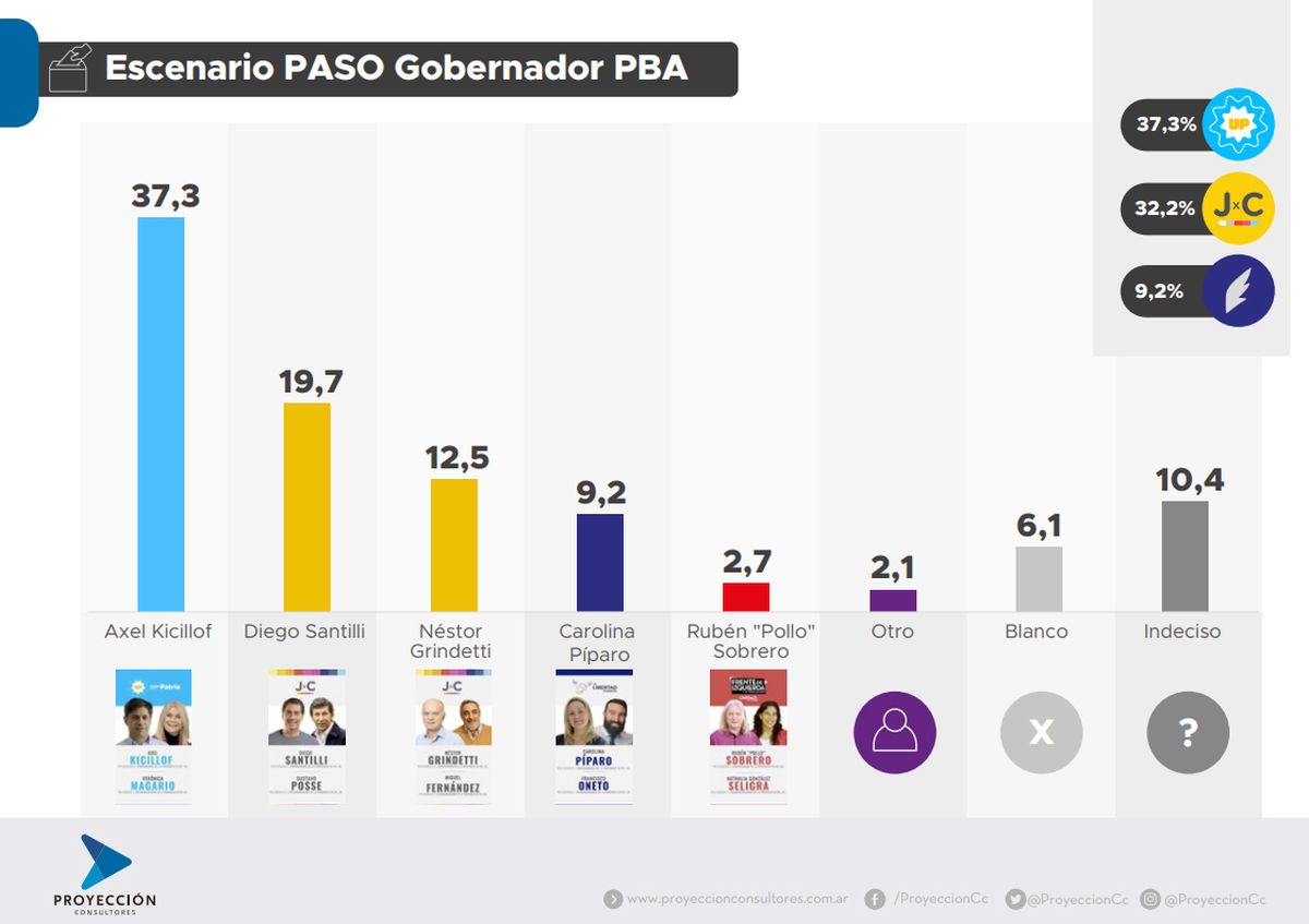 Oficializadas las fórmulas que competirán en las PASO por la gobernación bonaerense, la consultora Proyección hizo una encuesta de intención de voto que abarcó a 1.160 casos efectivos recolectados de forma online entre el 25 y el 27/06. El error muestral es de +/- 2,88%.