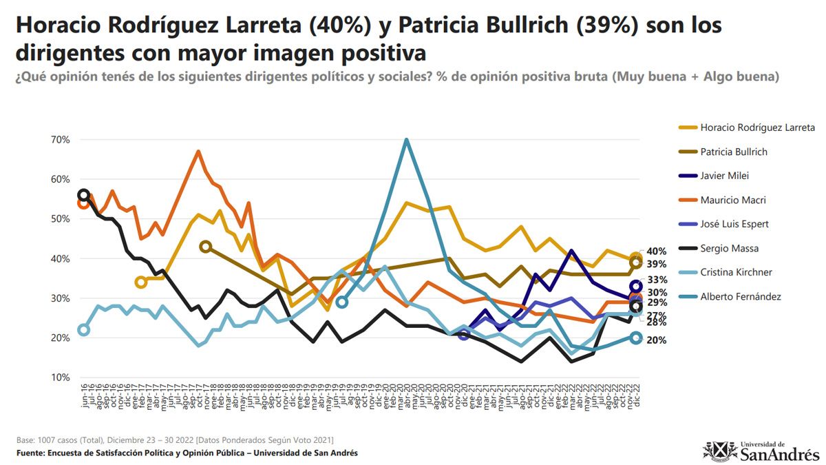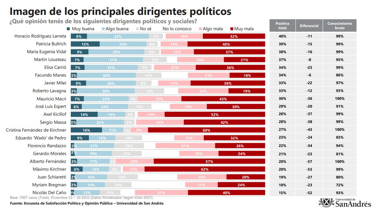 Con respecto a la imagen de los principales dirigentes políticos, quien tiene la mayor imagen positiva es Horacio Rodríguez Larreta (40%), seguido por Patricia Bullrich (39%) y María Eugenia Vidal (38%). De todos modos, estos 3 dirigentes cuentan con un diferencial negativo (es decir, mayores opiniones negativas que positivas). Por su parte, la imagen positiva de Mauricio Macri es del 30% y posee un diferencial negativo de -36.