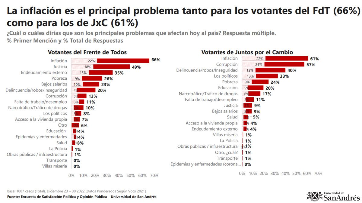 Otro dato que arroja la encuesta de la Universidad de San Andrés es que los votantes de JxC y los del FDT coinciden en que la inflación es el principal problema de la Argentina.