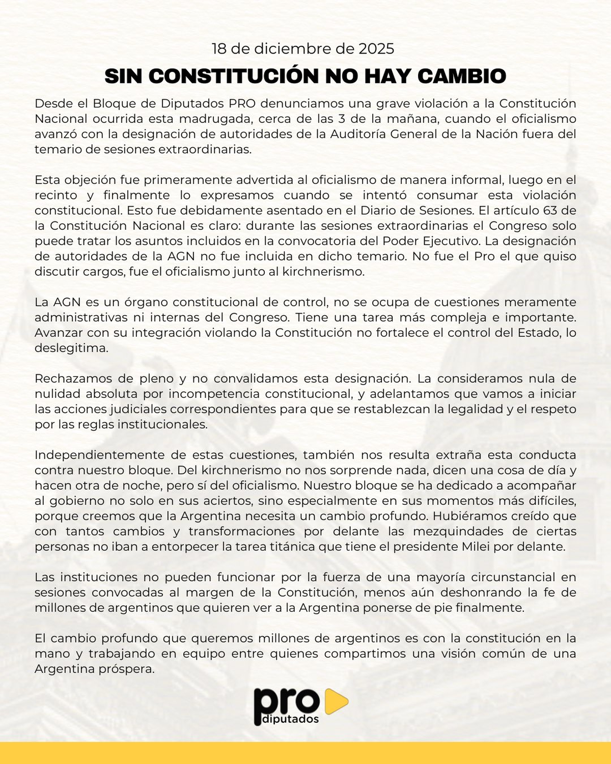 Tras la polémica jura de los nuevos integrantes de la AGN, los diputados del PRO emitieron el siguiente comunicado de prensa: