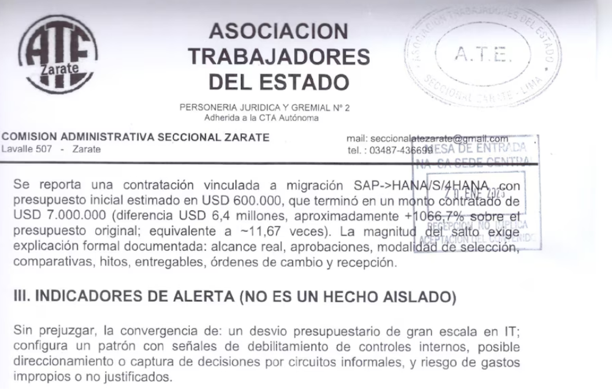 Luego, por la mesa de entrada de Nucleoeléctrica entró otra denuncia realizada esta vez por ATE-Zárate, para dar sus versiones de las presuntas irregularidades en el proceso de evaluación de la licitación por el servicio de limpieza, así como el pedido de investigación por una contratación de IT para una migración de un software de planificación de recursos empresariales que tuvo un salto de US$600.000 a US$7.000.000; es decir, un 1066,7% sobre el presupuesto original.