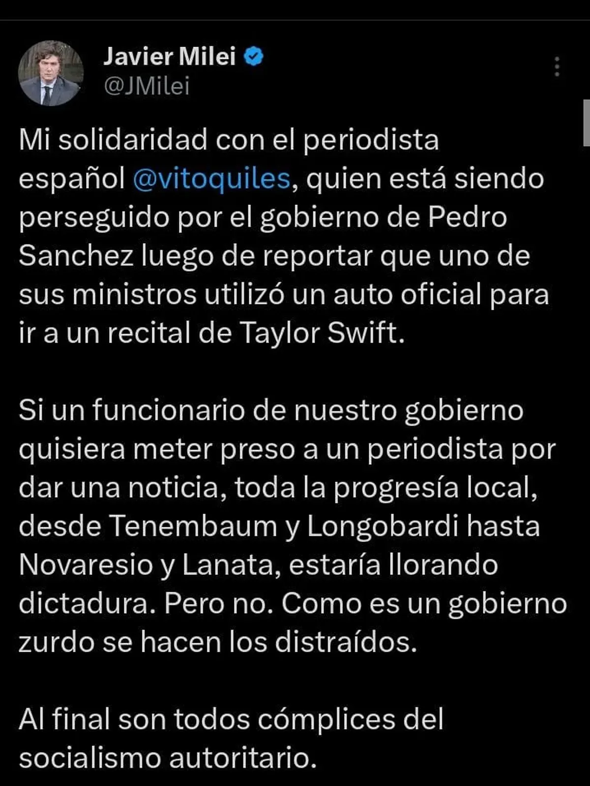 Pero Milei no se cayó y el (19/6) citó desde su cuenta personal de X (antes Twitter) un artículo del portal libertario La Derecha Diario que tituló: “Pedro Sánchez se desespera y anuncia un plan para "acabar con la impunidad" de los medios independientes que investigan la corrupción de su esposa”.