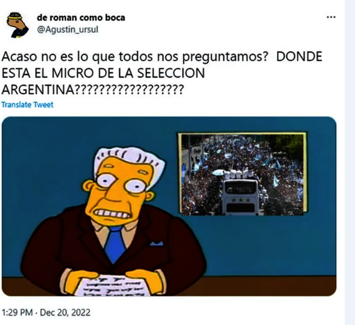Uno de los primeros en no salvarse de los memes fue ni más ni menos que el presidente Alberto Fernández. Hubo muchas burlas hacia la máxima autoridad argentina debido a sus acciones durante el 20 de diciembre. Por un lado, decretó el feriado nacional para que los hinchas pudieran tomarse el tiempo de ver a la Selección. Por otro, no puso orden y su estrategia para la situación resultó igual de desconcertante que el chofer del micro que llevaba a los jugadores.