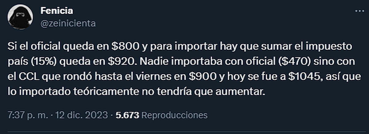 "Si el oficial queda en $800 y para importar hay que sumar el impuesto país (15%) queda en $920. Nadie importaba con oficial ($470) sino con el CCL que rondó hasta el viernes en $900 y hoy se fue a $1045, así que lo importado teóricamente no tendría que aumentar".