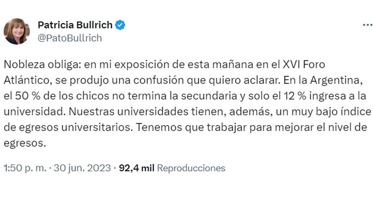 Patricia Bullrich aseguró este viernes (30/06), entre otras cosas, que "las universidades argentinas están vacías de alumnos argentinos porque casi la mitad de la matrícula la ocupan alumnos extranjeros que vienen y toman esos lugares", y expresó que "los argentinos quedan en un cementerio en el colegio secundario".