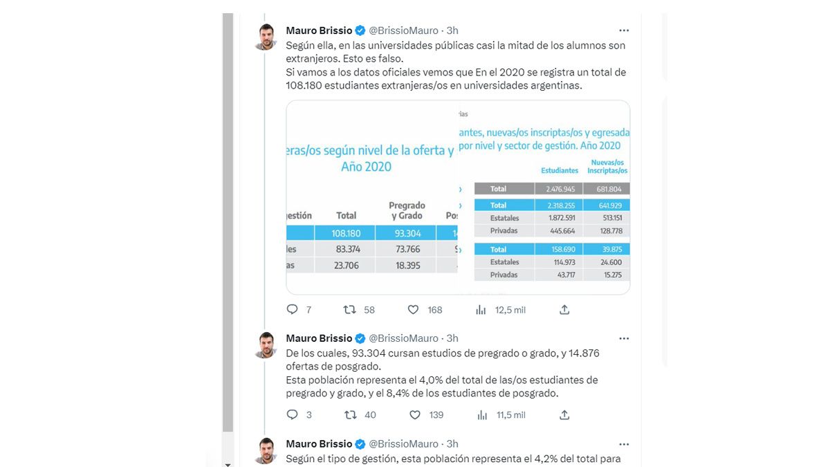 "Según ella, en las universidades públicas casi la mitad de los alumnos son extranjeros. Esto es falso. Si vamos a los datos oficiales vemos que en el 2020 se registra un total de 108.180 estudiantes extranjeras/os en universidades argentinas. De los cuales, 93.304 cursan estudios de pregrado o grado, y 14.876 ofertas de posgrado. Esta población representa el 4,0% del total de las/os estudiantes de pregrado y grado, y el 8,4% de los estudiantes de posgrado", escribió en Twitter.