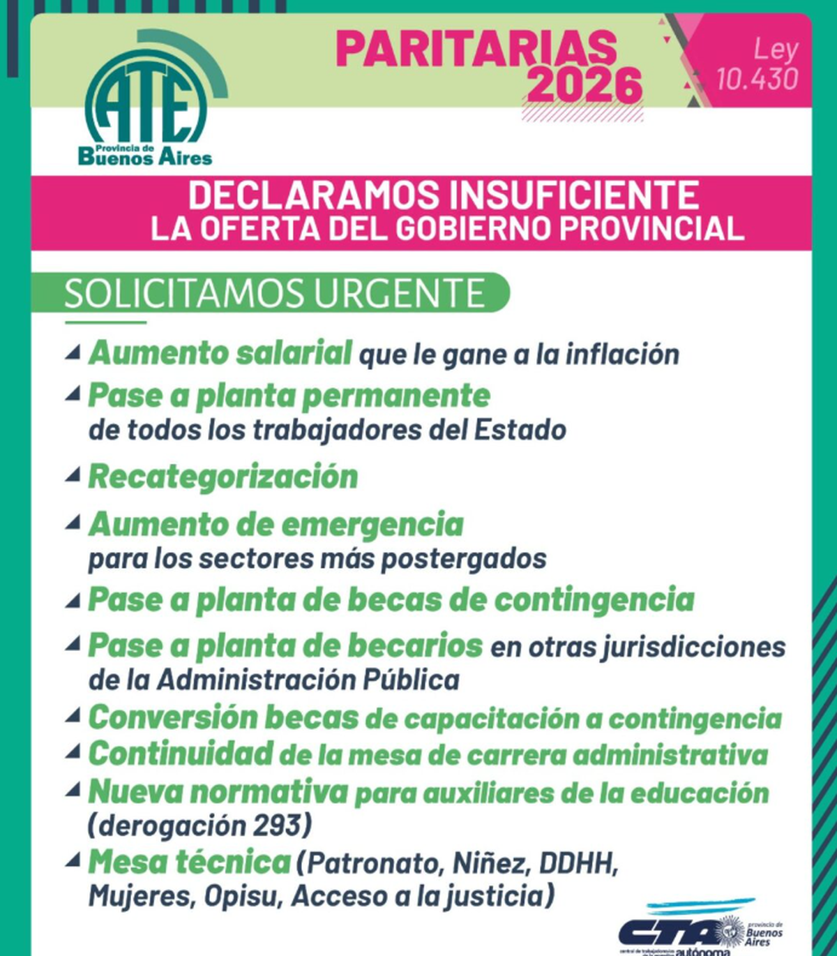 En la misma línea se expresó la Asociación de Trabajadores del Estado (ATE) de la provincia de Buenos Aires, que también declaró insuficiente la oferta del Ejecutivo provincial. El sindicato reclamó un aumento salarial que supere la inflación y exigió el pase a planta permanente de trabajadores estatales, procesos de recategorización y mejoras urgentes para los sectores más postergados.