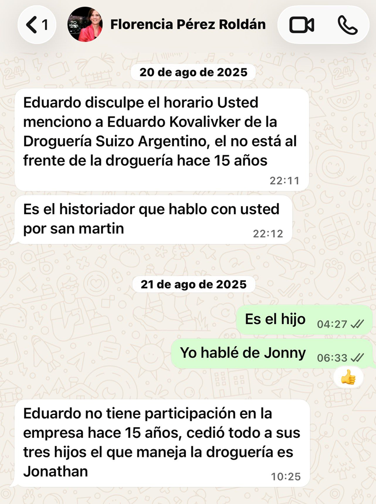 “Para aquellos que les gusta investigar, para aquellos que tendrían que ir a consultar a las fuentes, @rialjorge, @maurofederico, me hubieran preguntado a mí primero. La Sra Pérez Roldán me escribe a mí a las 22 y pico de la noche. Yo no contesto inmediatamente, por qué me duermo temprano. Me despierto todos los días a las 4 para trabajar”.