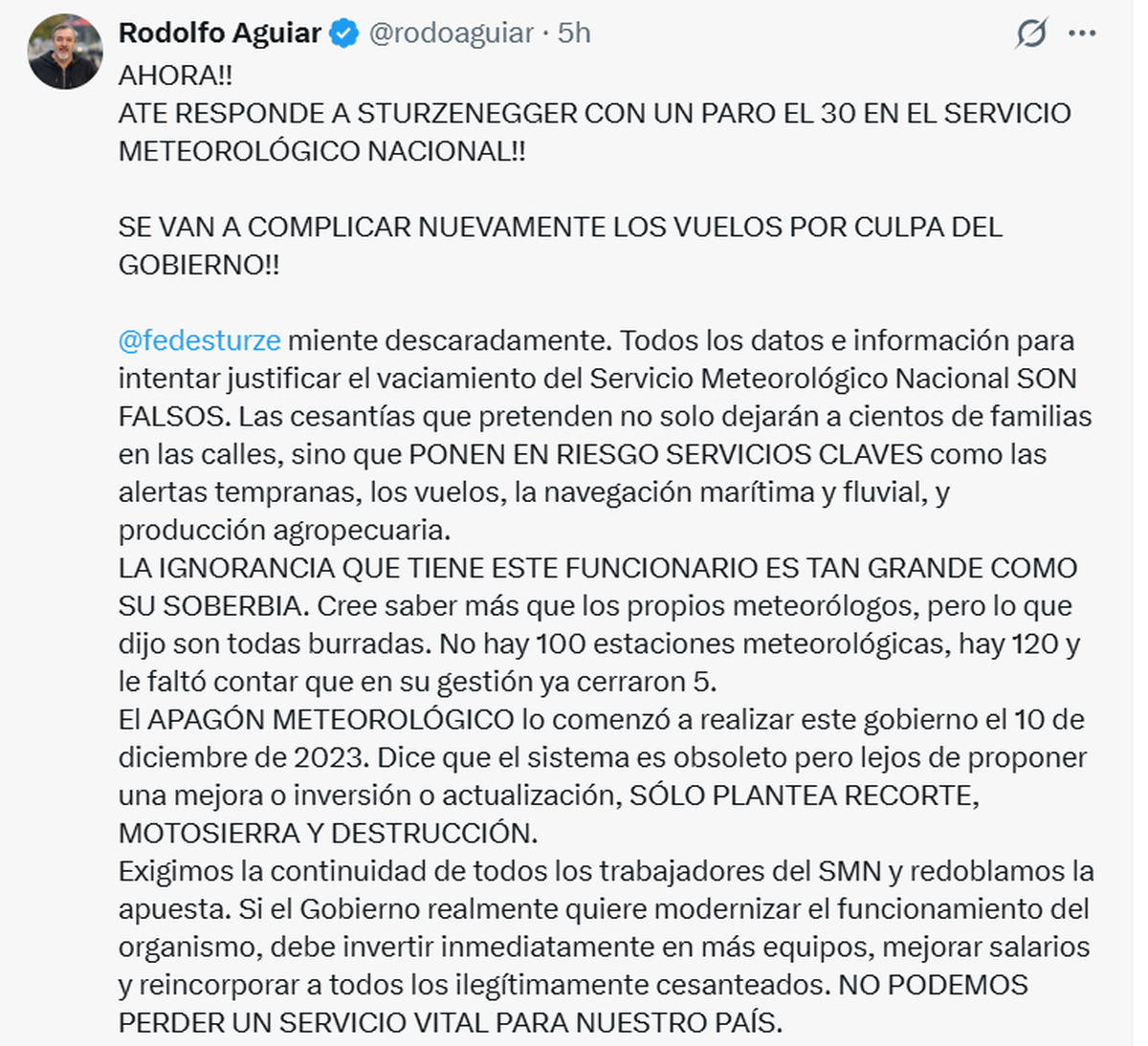 “Sturzenegger miente descaradamente. Todos los datos e información para intentar justificar el vaciamiento del Servicio Meteorológico Nacional son falsos. Las cesantías que pretenden no solo dejarán a cientos de familias en las calles, sino que ponen en riesgo servicios vitales como las alertas tempranas, los vuelos, la navegación marítima y fluvial, y producción agropecuaria”, señaló Rodolfo Aguiar, Secretario General de ATE Nacional.