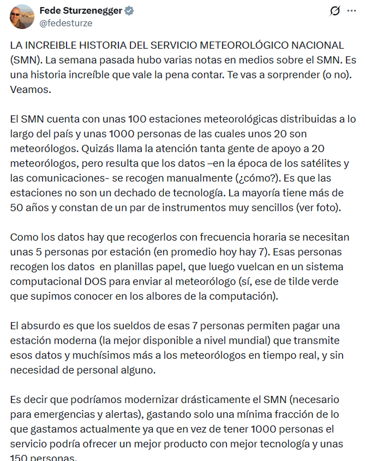 “La falta de conocimiento es muy grande, dice que son sólo 20 meteorólogos los que integran este organismo. Si realmente se interesara en saber cómo funciona, sabría que se trata de una estructura compleja de primer nivel que incluye meteorólogos, observadores, técnicos en instrumental, especialistas informática y procesamiento de datos, entre otros. Las estaciones combinan sistemas automáticos con observación humana, algo que sigue siendo indispensable en todo el mundo”, agregó Rodolfo Aguiar.