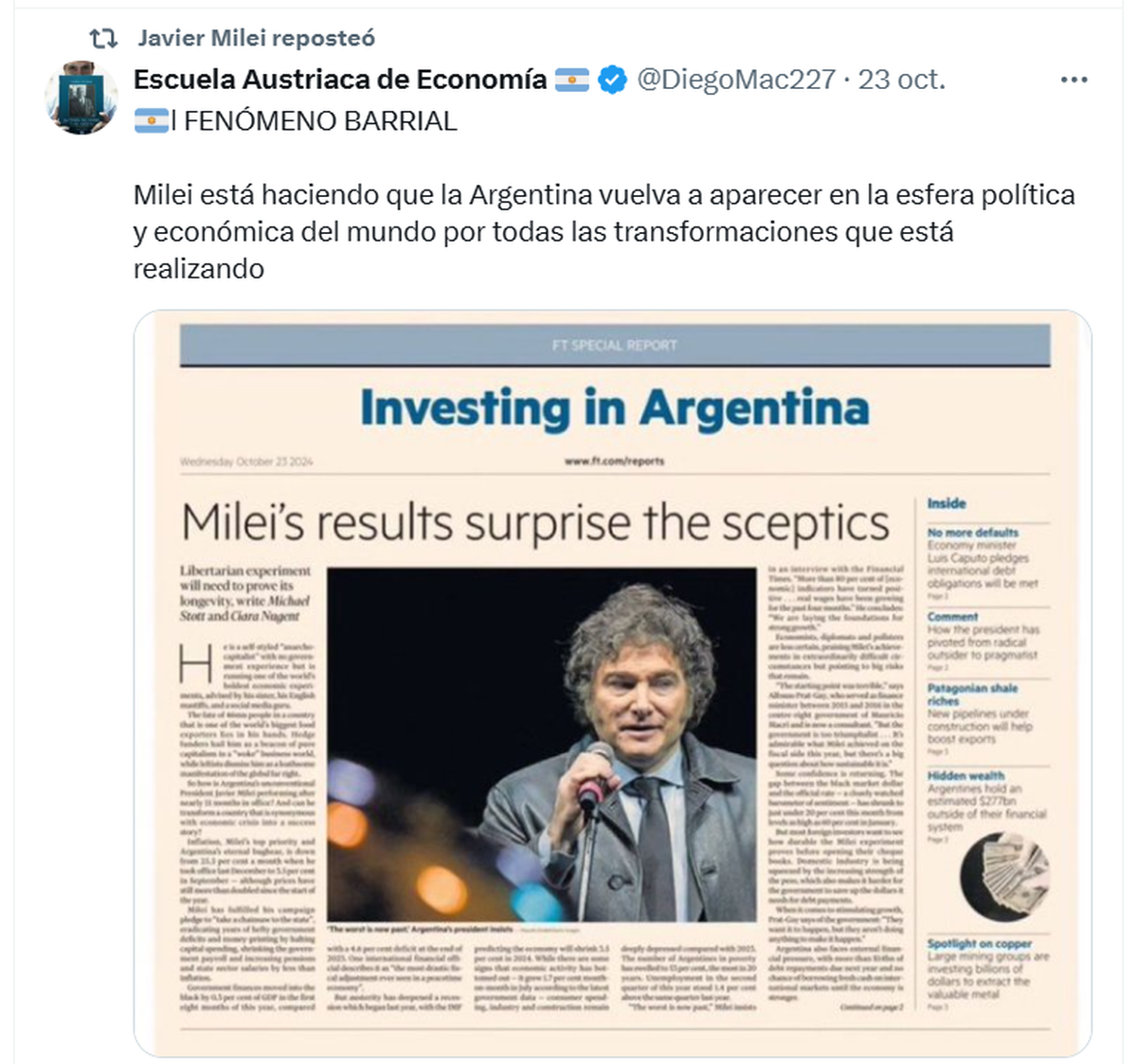 En el artículo, Financial Times destacó que el actual Presidente llegó a la Casa Rosada con la promesa de pasarle la motosierra al Estado, tras “dos décadas en las que los gobiernos peronistas casi duplicaron el tamaño del sector público e imprimieron dinero para financiar el gasto, lo que alimentó una severa inflación anual que alcanzó un pico de casi 300% a principios de este año”.
