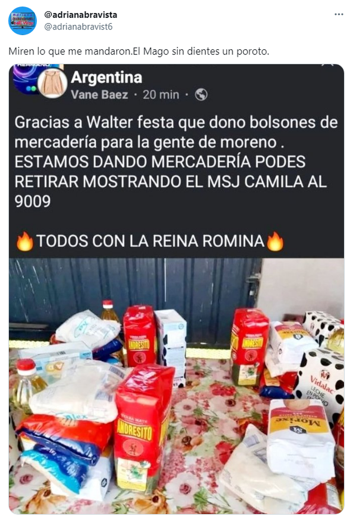 En tanto, desde grupos de WhatsApp y Facebook, además de trolls, Juntos por el Cambio viralizan que Festa reparte bolsas de alimentos y que hay que mostrar el mensajito al 9009, de votación contra otros participantes, en señal de apoyo a Uhrig. Por supuesto, no hay forma de chequear esas cadenas que suenan verosímiles.
