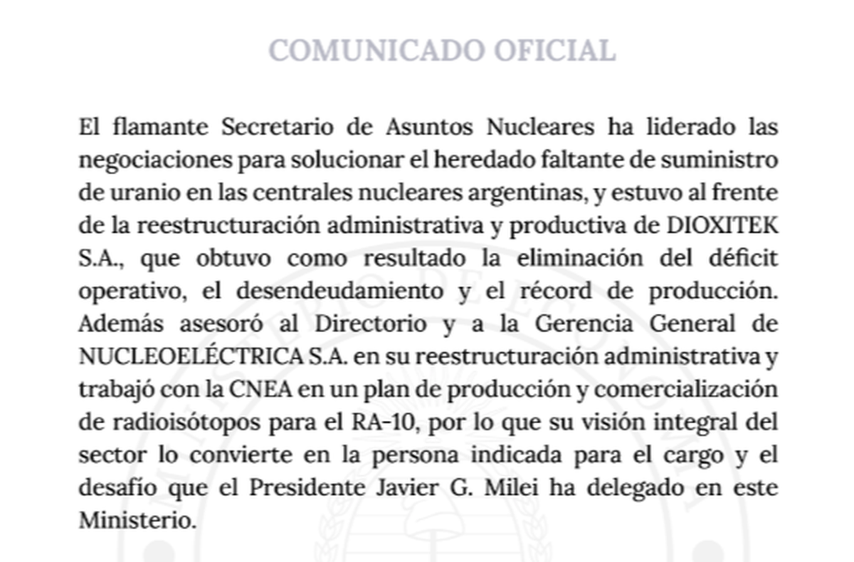 Javier Milei, vía ministerio de Economía, anunció este martes (09/12) la creación de la Secretaría de Asuntos Nucleares que será dirigida por Federico Ramos Nápoli, quien hasta ahora se desempeñaba como gerente de Dioxitek S.A. -productora de uranio para las centrales nucleares- pese a no tener experiencia en el sector.