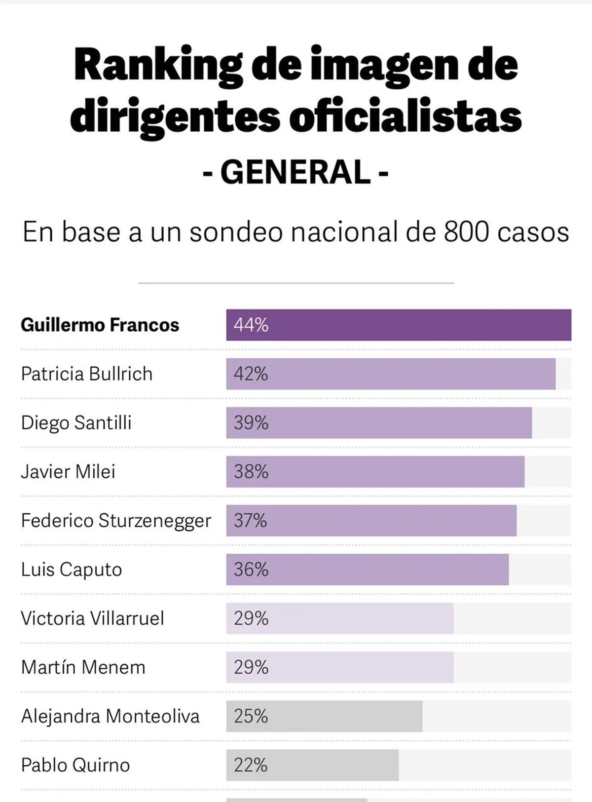 Por su parte, entre los dirigentes oficialistas, Guillermo Francos aparece encabezando un sondeo nacional de la firma D`alessio, IROL y Berensztein.