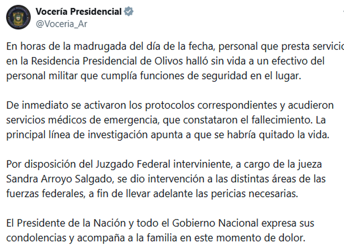 "En horas de la madrugada del día de la fecha, personal que presta servicio en la Residencia Presidencial de Olivos tomó conocimiento de un grave incidente ocurrido dentro del predio", comienza el comunicado oficial de la Presidencia de la Nación enviado a los medios de comunicación esta mañana.